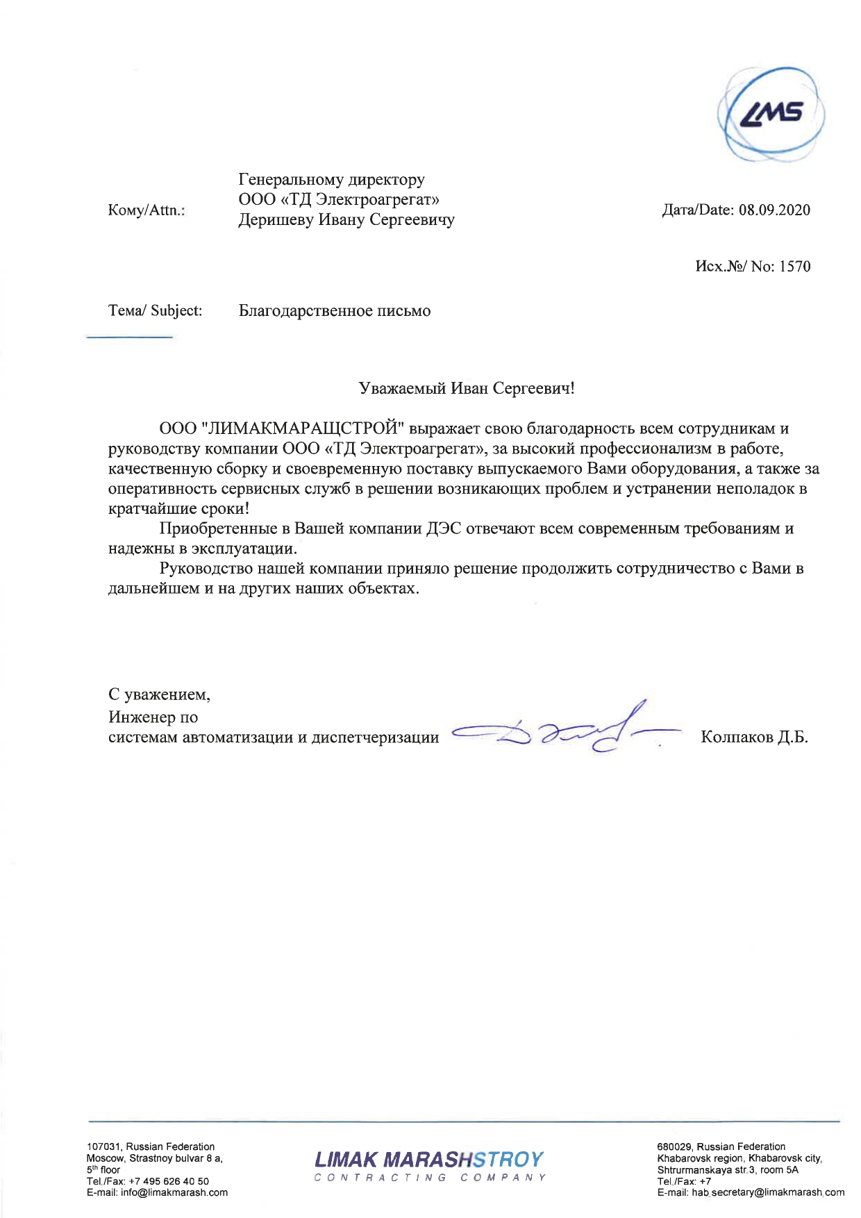 Отзыв контрагентов о компании ООО «ТД Электроагрегат» и  исполненном проекте для ООО "Торговый дом Промоснастка", г. Барнаул